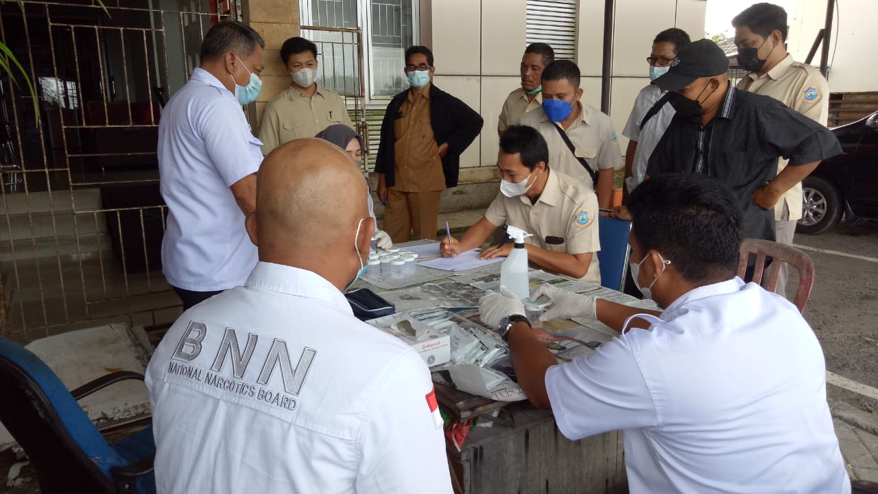 Beberapa pegawai dikantor itu tampak bingung dengan kedatangan personel BNN berseragam dan atribut lengkap dengan perlengkapan tes urine.