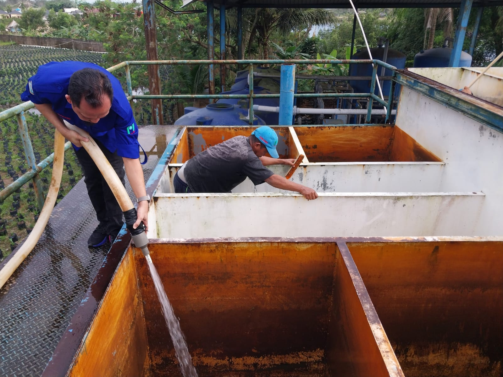 Demi kelancaran pengerjaan pengurasan Instalasi Pengolahan Air (IPA) dan reservoir produksi IPA Bacang, Plt Direktur Perumdam Tirta Pinang Masagus Hakim turun langsung ke lapangan memastikan pembersihan berjalan dengan maksimal.