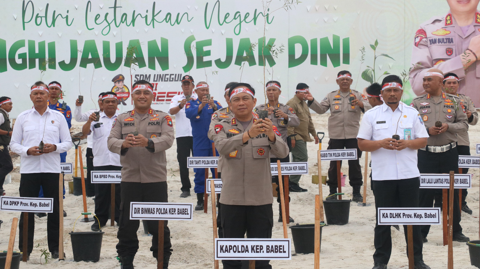 Lebih lanjut, Kapolda menerangkan dalam penanaman ini, Bangka Belitung akan melakukan penanaman berbagai jenis bibit pohon antara lain bibit kayu putih 1.000 batang, bibit jambu mete 900 batang, bibit pohon pinang 600 batang, bibit manggrove 4.300 batang, bibit ketapang 500 batang, bibit alpukat 200 batang, bibit durian 200 batang, bibit mahoni 200 batang, bibit sukun 100 batang, bibit cemara laut 300 batang, bibit blangir 1.000 batang, bibit mangga 600 batang dan bibit kayu camplung 100 batang.