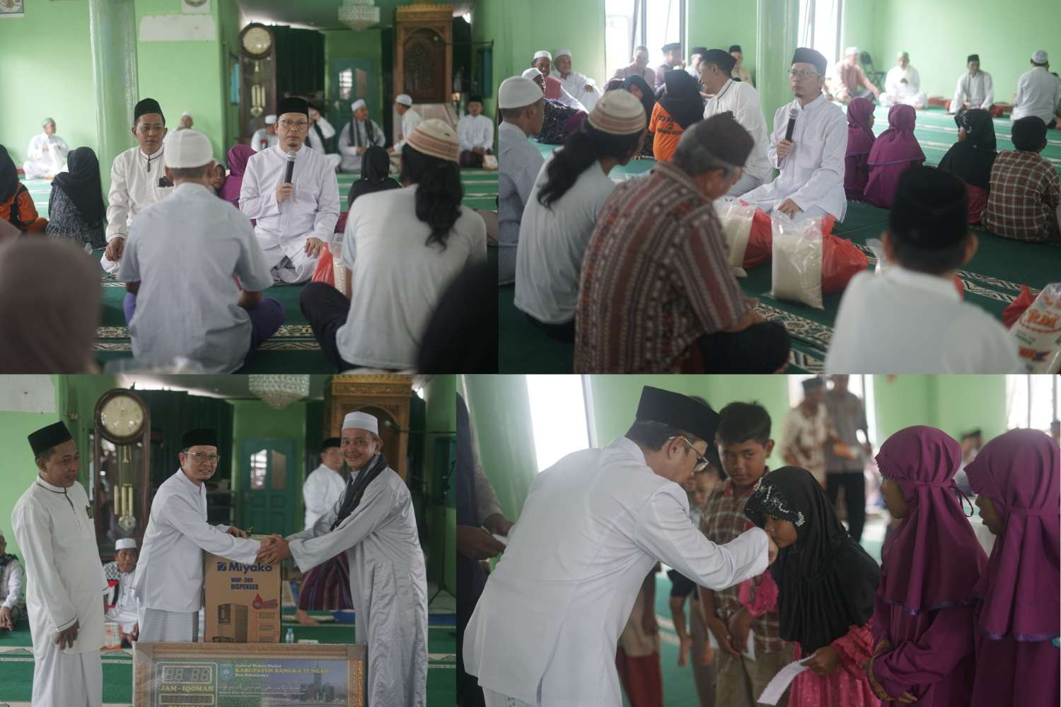 Seusai melaksanakan salat Jumat, orang nomor satu di Bangka Tengah ini juga menyerahkan bantuan 20 paket sembako kepada kaum duafa dan 20 santunan anak yatim, juga jam digital dan dispenser yang diberikan kepada ketua masjid.