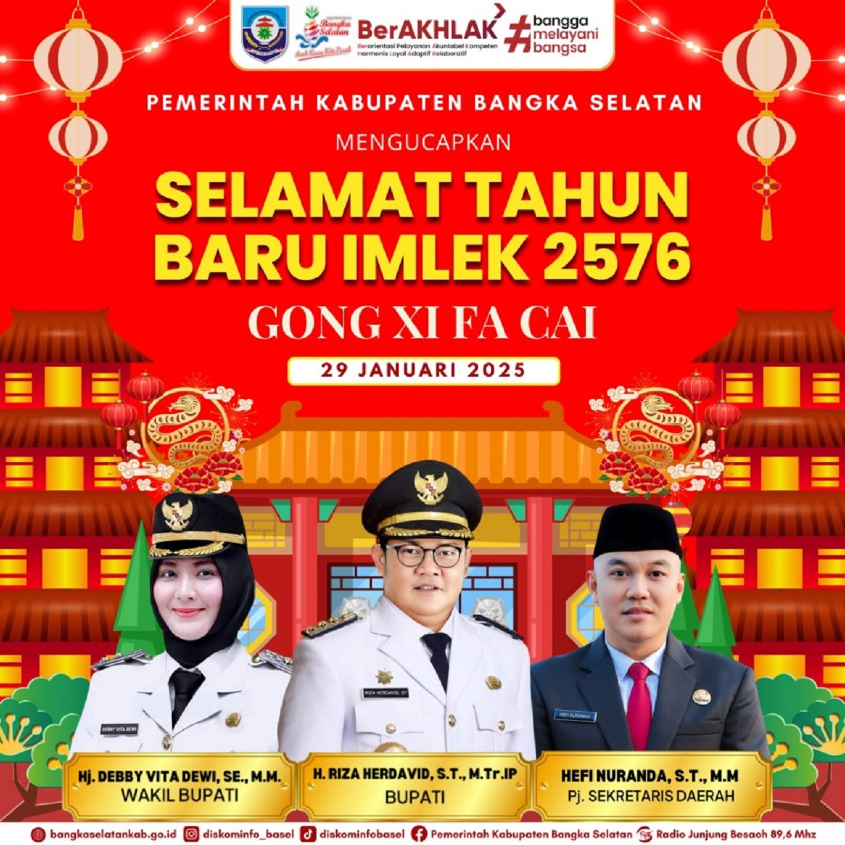 “Atas nama pribadi, keluarga, dan Pemerintah Kabupaten Bangka Selatan, saya mengucapkan Selamat Hari Raya Imlek 2025 kepada seluruh masyarakat Tionghoa, khususnya di Bangka Selatan. Semoga perayaan ini membawa kebahagiaan, kedamaian, serta keberkahan bagi kita semua,” ujar Riza.