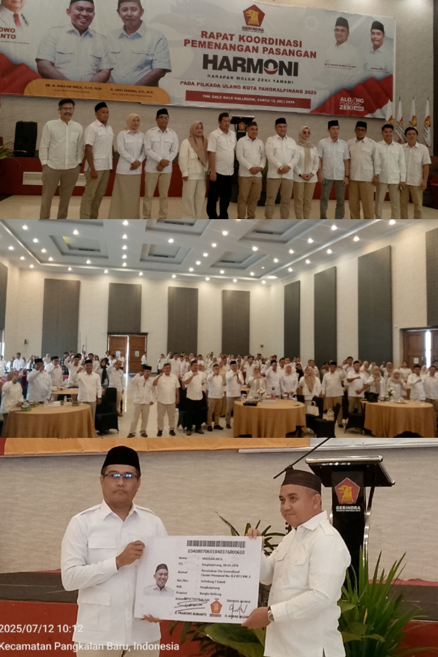 Pangkalpinang, Realistisnews.com – Dewan Pimpinan Daerah Partai Gerindra Provinsi Kepulauan Bangka Belitung akan ‘All out’ memenangkan pasangan HARMONI Maulan Aklil (Molen) – Zeki Yamani pada pemilihan Wali Kota dan Wakil Wali Kota yang akan berlangsung pada 27 Agustus 2025.