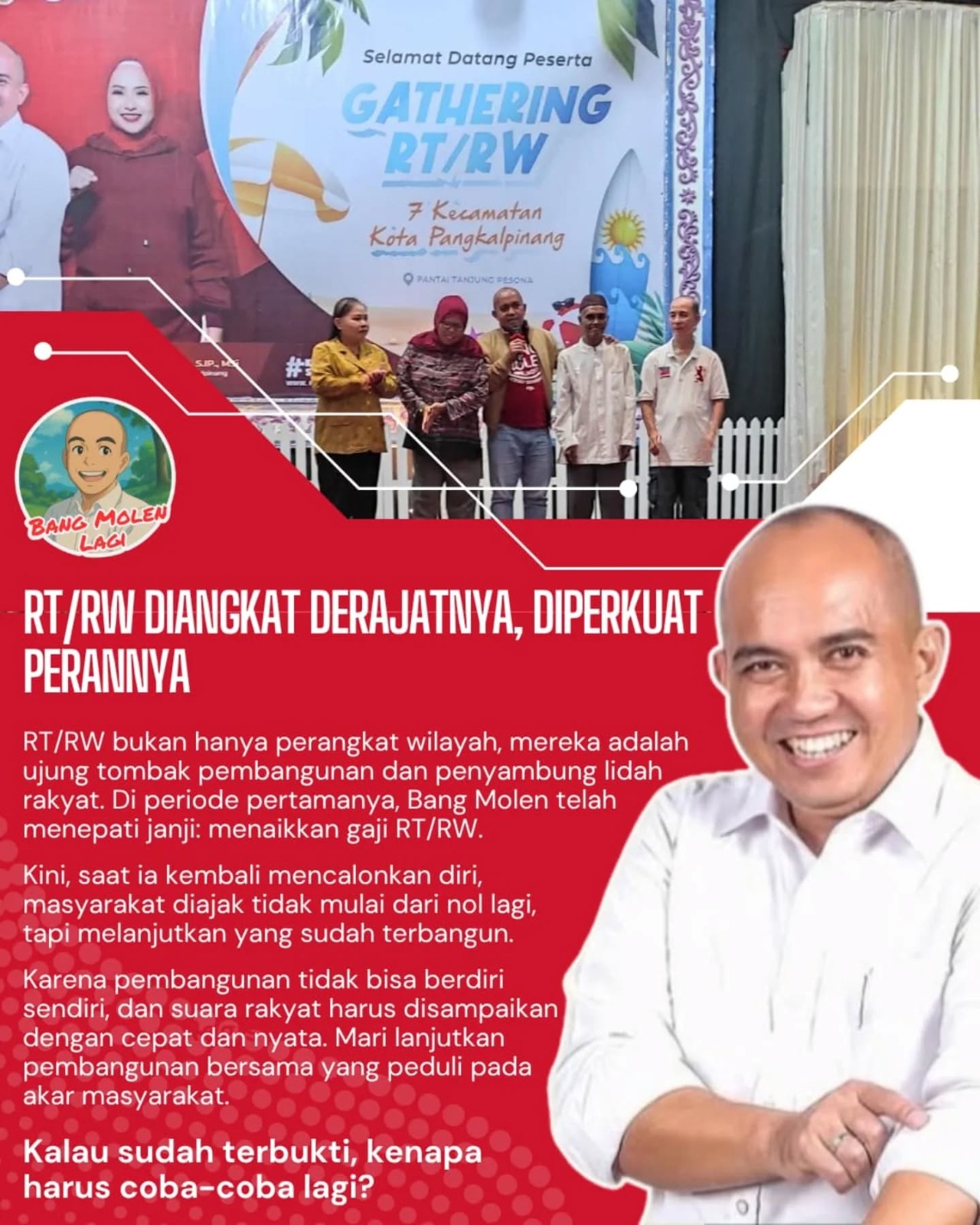 Kini, sebagai calon Wali Kota Pangkalpinang dari Partai Gerindra untuk periode mendatang, Molen menegaskan niatnya bersama calon wakilnya, Zeki Yamani, untuk melanjutkan perhatian pada sektor ini. Pasangan dengan tagline HARMONI (Harapan Molen-Zeki Yamani) ini menjadikan kesejahteraan tenaga non-ASN dan perangkat lingkungan sebagai salah satu prioritas utama jika kembali terpilih pada Pilkada 2024.