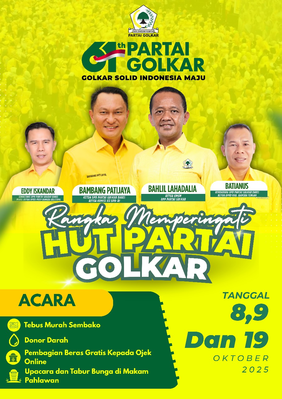 Babel, Realistisnews.com – Dalam rangka memperingati Hari Ulang Tahun Partai GOLKAR ke 61, DPD Partai GOLKAR Provinsi Bangka Belitung melaksanakan beberapa kegiatan kemasyarakatan di dalam bulan Oktober 2025 ini.